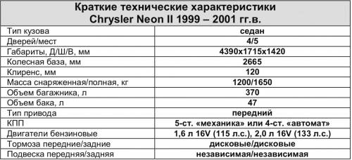 Продающиеся на нашем рынке 4-дверные седаны Neon в базовой комплектации могут иметь кондиционер, две подушки безопасности, стеклоподъемники на электроприводе, центральный замок и противоугонную систему. Модельный ряд силовых агрегатов ограничен двумя типами: поперечно расположенные бензиновые моторы объемом 1,8 (133 л.с.) и 2,0 л (155 л.с.), снабженные 3- и 4-ступенчатыми “автоматами” и 5-ступенчатой МКПП. 2-литровая модификация Chrysler Neon, более динамичная и резвая, у нас встречается значительно чаще. Особых хлопот своим владельцам двигатели не доставят при условии, что их не будут “насиловать”, а “кормить” станут только высококачественными сортами моторного масла и 92-м бензином. Использование топлива с пониженным октановым числом может привести к засорению инжекторной системы, промывку которой в профилактических целях рекомендуется осуществлять через 30 тыс. км пробега.
