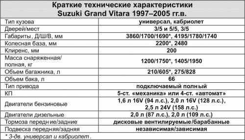 Наиболее популярны у нас Suzuki Grand Vitara с 2,0-литровой «четверкой» или 2,5-литровой «шестеркой» (1,6-литровые 4-цилиндровые моторы, как правило, устанавливались на 3-дверные модификации).