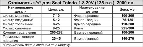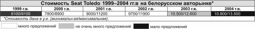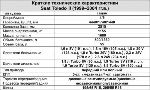 Линейка двигателей выглядит более скудной, чем у ближайшего «родственника» VW Golf IV, но это понятно, ведь Toledo рассчитан на более активных водителей, чем «народный» автомобиль. Самый слабый двигатель – 101-сильный 1,6-литровый бензиновый, наиболее популярным у нас является 1,8-литровый силовой агрегат с пятью клапанами на цилиндр (125 л.с.). Есть Toledo и с турбированной версией мотора объемом 1,8 литра и мощностью 180 л.с., применявшегося также на хэтчбеке Leon. Автомобили с пятицилиндровым двигателем необычной двухрядной схемы VR5 (2,3 л, 170 л.с.) у нас встречаются крайне редко, поэтому при покупке такой версии будьте осторожны. Есть еще одна редкая на белорусском рынке модификация - Toledo Cupra с полным приводом и двигателем V6 (204 л.с.).