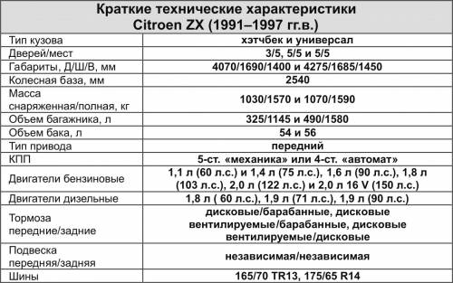 Все силовые агрегаты, равно как и трансмиссии, достались ZX в наследство от моделей AX и BX. Бензиновых двигателей было шесть. Два силовых агрегата оснащены моновпрыском: 1,1 л (60 л.с.) и 1,4 л (75 л.с.). Остальные шли с распределенным впрыском, и для каждой версии свой мотор. Например, 1,6 л (90 л.с.) был доступен для Aura. 1,8 л (103 л.с.) - для спортивного 3-дверного ZX Furio. Самые мощные двигатели - двухлитровые: 2,0 л (122 л.с.) и топ-версия 16V с силовым агрегатом в 150 л.с. предназначались для версии Volcane. На нашем рынке преимущественно представлены машины с бензиновыми двигателями объемом 1,4 и 1,6 литра. Мощные и надежные, при правильном уходе они служат 300–500 тыс. км. Где-то на рубеже в 300 тыс. км может начать «дымить» двигатель. Эта проблема ликвидируется заменой маслоотражательных колпачков клапанов. Однако, приобретая бензиновый ZX, стоит помнить о том, что у моторов первых годов выпуска есть проблемы из-за неудачной конструкции шланга вентиляции картера и регулировки оборотов холостого хода.