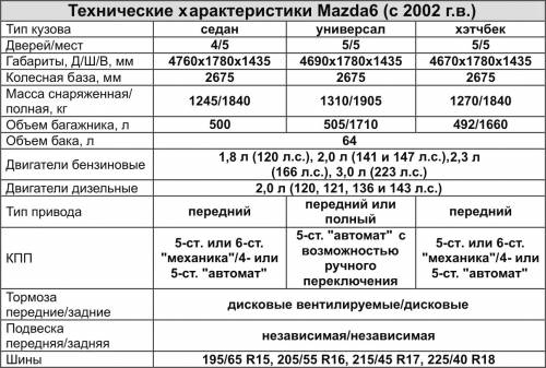 Ну что тут сказать. Mazda6 - умница, красавица, спортсменка. Если позволяют финансовые возможности, то ее можно брать не раздумывая, но желательно уберечь себя от американских версий и внимательно присматриваться к автомобилю с “автоматом” (при покупке обязательно наведайтесь на компьютерную диагностику). Бензиновые двигатели беспроблемны все, но 2,3-литровая модификация «кушает» слишком уж много масла.