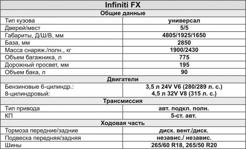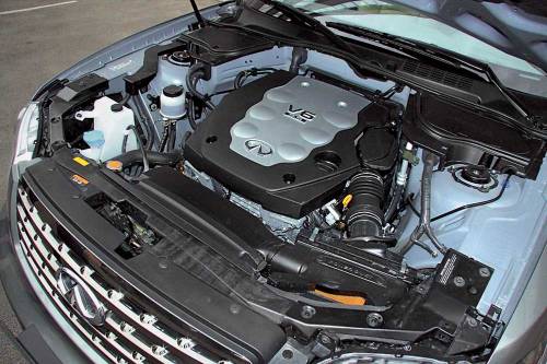 Для FX предназначены два бензиновых мотора с алюминиевым блоком цилиндров: V6 объемом 3,5 л (FX35) и V8 – 4,5 л (FX45). Они применяются во всем модельном ряду Infiniti, а 3,5-литровый еще и в спортивных моделях Nissan – Skyline GT-R и Z350.