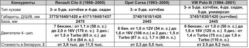 Corsa стоит дороже, чем Clio и Fiesta одних и тех же годов выпуска. Однако цены на ее обслуживание и запчасти вполне приемлемые. Нет серьезных претензий и к надежности Corsa. Ее салон оформлен богаче, чем у Fiesta, и он более удобный, правда, выполнен из не очень качественных материалов. Со временем, когда крепеж пластиковых деталей разбалтывается, они начинают назойливо поскрипывать. Вместительность грузового отсека – наибольшая среди упомянутых конкурентов.