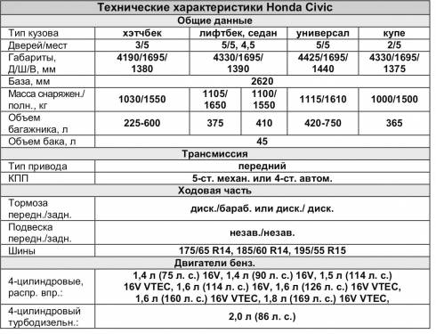 Civic – не исключение. Этот автомобиль обычно попадает к людям, любящим получать много удовольствия от езды. И обычно он их не подводит. Под капотом большинства перепродаваемых машин этой марки скрывается двигатель объемом 1,4 литра, имеющий мощность 90 л.с. Вроде бы и немного, но при нормальной эксплуатации должно хватить. Необходимо только помнить об одном важном правиле обращения с большинством транспортных средств Honda: не жалейте оборотов! Чем больше, тем лучше. Если на тахометре меньше 3500 об./мин – ничего особенного от машины ожидать не стоит.