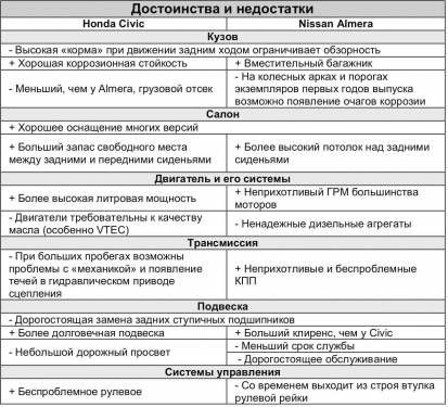 По потребительским качествам Almera не слишком уступает Civic, а по некоторым «дисциплинам» даже опережает. Поэтому при выборе опирайтесь на свой темперамент: Civic порекомендуем активным водителям, а Almera – тем, кто не любит особо выделяться и в первую очередь ценит внутреннее содержание, а не внешность. Вместе с тем ввиду спортивного темперамента найти Civic в хорошем техническом состоянии будет сложнее, чем Almera.