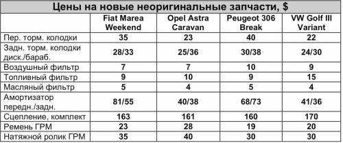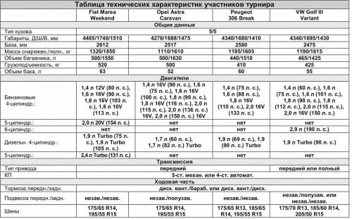 Автомобили – VW Golf III Variant, Opel Astra Caravan, Fiat Marea Weekend и Peugeot 306 Break – все попадают в общую ценовую категорию от $ 2,5 тыс. до $ 12 тыс. (в зависимости от годов выпуска, техсостояния и комплектации). Высокая максимальная стоимость обусловлена тем, что «итальянец» и «француз» выпускались вплоть до 2002 года, тогда как «немцы» представили очередные поколения своих моделей на четыре года раньше. Самая доступная модель – Astra Caravan: в зависимости от возраста за нее на отечественном рынке подержанных автомобилей просят от $ 2,5 тыс. до $ 6 тыс.
