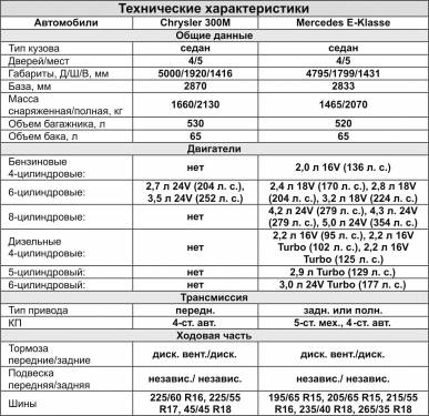 В противовес престижу Mercedes E-класса, его лучшей динамике, большему выбору различных модификаций и более развитой сети сервисного обслуживания Chrysler 300M предлагает неординарную внешность, не менее богатое оснащение, просторный салон, долговечную подвеску и возможность эксплуатации на более доступном бензине А-92. Нет серьезных претензий и по поводу надежности «трехсотки» – по одним дисциплинам она проигрывает, а по другим – превосходит «ешку». 300М – вполне оправданное приобретение для тех, кто предпочитает быть оригинальным, а вот немецкий E-класс для тех, кому имидж дороже всего.