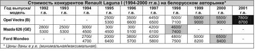 Самая популярная представительница автопрома Франции занимает лидирующее положение на рынке подержанных автомобилей Беларуси. Цены варьируются от 2700 до 8400 у.е. Что же мы приобретаем, покупая «Лагуну» первого поколения? Ответы тоже варьируются от «Merde!» до «Сharmant!”.