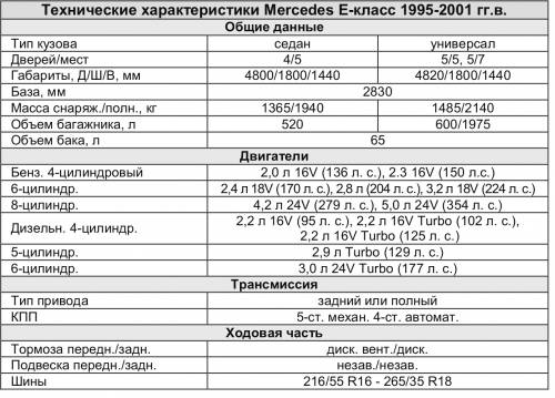 Ощутимо более дорогие E 290 TD (5 цилиндров, турбонаддув, 129 л.с.) и E 300 D (6 цилиндров в ряд, 136 л.с.) выглядят на дороге уже вполне достойно. Разница лишь в том, что «шестерка» работает плавнее, но набирает обороты по-дизельному спокойно, а у «пятерки» чувствуется бодрый турбоподхват. В середине 1997 года на смену Е 300 D пришел Е 300 TD – 6 цилиндров в ряд, турбонаддув, 177 л.с. Этот ни в цене, ни в разгонной динамике не уступает бензиновому Е 280.