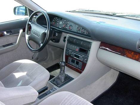 Что касается салона, то в глаза в первую очередь бросается его вместительность. Водитель и пассажир на переднем сиденье могут вольготно раскинуться, не задевая при этом друг друга локтями и коленями. Особо стоит отметить водительское сиденье. В меру жесткие спинка и подушка подойдут по высоте и ширине любому водителю. Спинка обладает также хорошо выраженной боковой поддержкой. В таком сиденье можно провести без усталости много часов. Водительское сиденье регулируется по длине, углу наклона спинки и высоте подушки. Сзади вполне хватит места для трех взрослых человек. Багажник у Audi 100 также не назовешь маленьким, его объем 510 литров. Материалы в салоне высококачественные, все металлические стойки обшиты тканью. Еще одна особенность салона - масса полочек и карманчиков для мелких вещей, большой перчаточный ящик, крышка которого открывается вниз, что не позволяет вещам выпадать. Управление освещением возложено на маленький подрулевой переключатель. Отопление салона осуществляется тремя стандартными ручками-кругляшками. Управлять потоком воздуха могут не только сидящие спереди, но и задние пассажиры. На уровне и звукоизоляция салона. Закрыв за собой дверь и отгородившись от шума улицы, можно спокойно разговаривать тихим голосом – собеседник будет вас прекрасно слышать. Правда, в автомобилях 1991 г.в. отмечены аэродинамические шумы (свист ветра в передних дверях), которые устраняются в любой авторемонтной мастерской путем простейшей регулировки дверных замков. Случаются неполадки с системой механического открытия – закрытия люка, перекос самого люка, подтекание уплотнителя – эти проблемы также легко решаемы при помощи регулировок или заменой недорогих деталей.