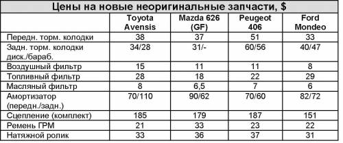 Подвески всех автомобилей отличаются хорошей энергоемкостью. Правда, за это приходится дорого платить. Так, у «четыреста шестого» на наших дорогах ходовая служит меньше, чем у остальных участников обзора, и ее придется ремонтировать чаще всего. Чуть дольше служит подвеска Mondeo. Кстати, недешевое удовольствие и замена ШРУСов Peugeot 406 – они поставляются только в сборе с полуосью (оригинальная деталь дороже $ 250). Подвеска «японцев» самая долговечная, правда, ее обслуживание обходится дороже, чем у остальных машин. Дело в том, что большинство сайлент-блоков и втулок поставляется вместе с рычагами и тягами. К примеру, задняя продольная тяга Mazda 626 стоит около $ 100, а у Avensis и того дороже – $ 155.