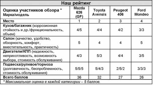 Учитывая основные достоинства и недостатки каждого из участников обзора, звание лучшего седана мы отдали Mazda 626 – он набрал 36 баллов (см. табл.). Немного отстает от него Toyota Avensis – 32 балла. Разрыв между «японцами» и «европейцами» достаточно заметный. Peugeot 406 набрал 27 баллов, а Ford Mondeo – 26 баллов.