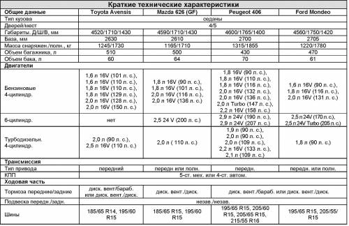 В нашем обзоре мы выясним, какой же из автомобилей лучше – Toyota Avensis, Mazda 626 (GF), Peugeot 406 или Ford Mondeo. Чаще всего в Беларуси встречаются бензиновые версии данных авто, оснащенные механическими коробками передач, что вызвано особенностями нашего рынка. Хотя при желании несложно будет отыскать и версию с автоматической трансмиссией. Все машины имеют привод на передние колеса, правда, в арсенале «626-й» и Mondeo есть и полноприводные модификации, но найти их в Беларуси практически нереально, особенно среди Mazda 626.