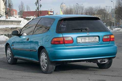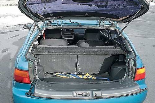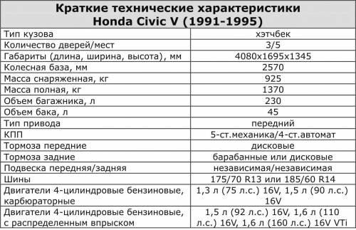 Внешность Civic V на самом деле напоминает табуретку – маленький, приземистый, коренастый автомобильчик. Обращать внимание на салон бессмысленно - все просто, серо, безлико. При этом стоит отметить вполне удобные сиденья. Этот автомобиль создан для водителя с одним пассажиром – сзади настолько мало места, что даже хрупкие девушки невысокого роста упираются коленями в передние сиденья. Посадка тоже требует определенных акробатических навыков из-за низкого расположения сидений. Одна из особенностей трехдверного Civic – необычная конструкция крышки багажника, состоящей из двух частей. Верхняя часть – это заднее стекло, а нижняя – металлическая дверь, но открываются они отдельно. Столь непривычная система на самом деле очень удобна – верхней (стеклянной) половиной можно пользоваться, если нужно положить небольшую поклажу, а если габариты груза побольше, то можно опустить и металлическую часть. Однако понятие «багажник» в этом автомобиле чисто номинальное, и его полезный объем составляет всего 230 литров.