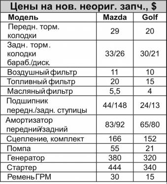 Конструктивно подвески машин немного отличаются. Впереди в обеих применен традиционный McPherson, а вот сзади в Mazda 323 установлена независимая подвеска, а у VW Golf – полузависимая балка. Поэтому лучшей устойчивостью отличается японский автомобиль, он увереннее «шлифует» повороты и более цепко держится на заданной траектории. Вместе с тем «ходовая» Mazda 323 дороже в обслуживании – сайлент-блоки задних продольных тяг поставляются в сборе с рычагами (запчасть – около $ 60), задние подшипники – только вместе со ступицами (около $ 150).
