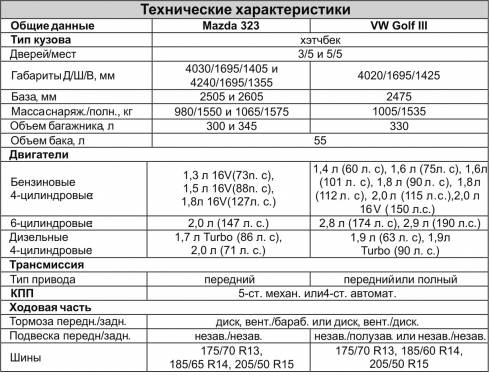 Несмотря на имеющиеся недостатки, VW Golf III подойдет тем, кому нужен по-настоящему практичный и функциональный автомобиль, имеющий имидж надежной и долговечной модели. При этом, правда, придется смириться с некоторой общей невыразительностью его облика. Благодаря вышеупомянутым качествам, VW Golf III заслуженно пользуется популярностью у отечественных автолюбителей. Хотя спрос на него определяет более высокую, чем на Mazda 323, рыночную стоимость. Приемлемая стоимость обслуживания и запчастей, небольшие размеры, универсальность – вот основные качества, за которые этот автомобиль ценят отечественные потребители. И за что, собственно, и переплачивают.