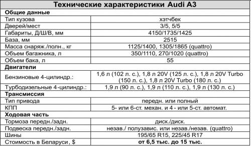 «Тройка» построена на общей платформе концерна VW, но позиционируется как хэтчбек премиум-класса, поэтому уровень ее продаж был невысоким – за годы производства суммарное количество сошедших с конвейера машин даже не приблизилось к годовому выпуску Golf IV. Audi A3 – «реперная» точкай отсчета для всего гольф-класса в том, что касается имиджа, качества изготовления, ездовых свойств... Но стоит ли переплачивать за это?