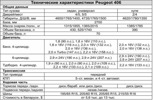 Peugeot 406 представлен наиболее ходовыми в данном сегменте рынка модификациями – 4-дверным седаном и 5-дверным универсалом Break. Несколько особняком стоит стильное купе, которое Peugeot позиционирует как отдельную модель. Разработкой ее дизайна занималось известное автомобильное ателье – Pininfarina, на производственных мощностях которого и собирали эту модификацию 406-го. У нас такие машины встречаются нечасто.