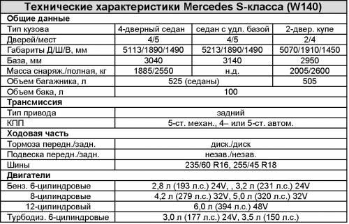 Первыми модификациями W140, которые предлагались покупателям сразу после премьеры автомобиля, были бензиновые 6-цилиндровые версии 280S (193 л.с.) и 320SEL (231 л.с.), а также 279-сильная 8-цилиндровая 420SE/SEL, сочетающая в себе приемлемую цену, мощность и, естественно, престижность. Несколько позднее гамму дополнили сразу полюбившиеся нашими соотечественникам 5-литровая версия 500 SE/SEL, имеющая 4 клапана на цилиндр и мощность 320 л.с., а также “убойная” 12-цилиндровая модификация 600SEL, способная “выдавать” 394 силы.
