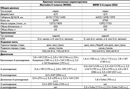 В годы выпуска этих машин каждый производитель предусмотрел для своего детища главный козырь. Mercedes С-класса (W202) привлекал покупателей престижностью и богатыми комплектациями, а BMW 3-й серии (Е36) - скоростными характеристиками и широким выбором модификаций - их пять (седан, хэтчбек, купе, кабриолет, универсал), в отличие от двух у W202 (седан и универсал). Сегодня мы сравним потребительские качества наиболее распространенных в Беларуси версий с 4-дверным кузовом “седан”.