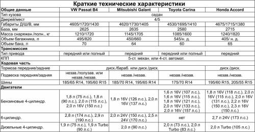 Сегодня мы вывели на “ринг” наиболее распространенные в Беларуси машины среднего класса: одного “немца” - VW Passat B4, и трех “японцев” - Mitsubishi Galant Е50, Toyota Carina Е и Honda Accord. Рыночная стоимость этих машин практически равна, поэтому определяющую роль при выборе сыграют потребительские качества.