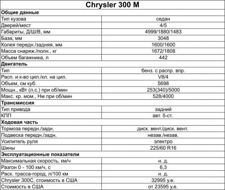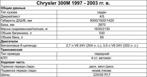 Этот автомобиль удачно совмещает комфорт и внушительность американских “дредноутов” с технологиями европейского автомобилестроения. Внутри 5-метрового стильного и стремительного корпуса - царство роскоши и комфорта. Но в жертву экстравагантному дизайну у Chrysler 300М принесена обзорность - она ограниченна, особенно при движении назад. Богатство комплектации - палка о двух концах. К сожалению, надежность американских машин оставляет желать лучшего: электроника нередко пошаливает (к примеру, часто выходит из строя центральный замок). Так что обязательное условие при покупке - проверка всех возможных приводов и систем.
