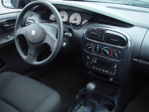 Салон автомобиля просторный. Удобно устроиться за рулем сможет любой желающий, поскольку размеры салона Neon выполнены с запасом. Места в нише для ног больше, чем у одноклассника Honda Civic. Водительское кресло расположено высоко. Передний обзор через лобовое стекло прекрасный, стойки “не давят”. Однако спойлер на крышке багажника ограничивает видимость в зеркале заднего вида. Белые циферблаты на панели приборов, трехспицевый руль придают внутреннему облику автомобиля спортивности. Удобные сиденья, ткань темно-серого цвета, немаркая, хорошего качества. Пластик панели на ощупь добротный, мягкий. Можно сделать вывод: салон комфортабельный, функциональный, но без лишней роскоши и изысков. Автомобиль оснащен великолепной аудиосистемой с CD-проигрывателем, а центральный замок теперь устанавливают на все модификации в базе. В комплектации SXT оказался круиз-контроль и кондиционер, не говоря об электроприводе стекол и зеркал.