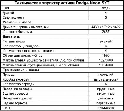 Гамма двигателей Neon состоит из стандартного 2,0-х литро- вого силового агрегата мощностью 132 л.с., 177 Нм (SE и SXT), тот же двигатель в исполнении Magnum (150 л.с., 183 Нм, версия R/T), а SRT-4 оснащают 2,5-литровым турбомотором, развивающим 215 л.с. (332 Нм). Под капотом нашего “подопытного кролика” “шустрый” 16-клапанный мотор, обладающий чрезвычайно умеренным аппетитом, несмотря на автоматическую трансмиссию. Коробка передач – 4-ступенчатый “автомат”. Двигатель прекрасно реагирует на педаль, без видимых ям. Мы бы охарактеризовали его прилагательным - отзывчивый.