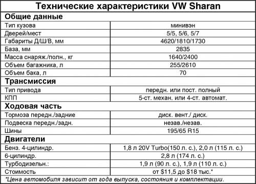 Sharan - 5-дверный минивэн с боковыми дверями распашного типа. Менее дорогие версии внешне можно отличить по неокрашенным бамперам. Впрочем, большинство автомобилей этой модели, которые эксплуатируются в Беларуси, хорошо укомплектованы. Линейка силовых агрегатов Sharan включает 3 бензиновых и 2 турбодизельных мотора. При своевременном обслуживании двигатели «выхаживают» 250 - 350 тыс. км. Рядно-смещенный агрегат VR6 объемом 2,8 л боится перегрева, который как минимум чреват дорогостоящим ремонтом сложной по конструкции головки блока цилиндров. ГРМ во всех двигателях оснащен гидрокомпенсаторами тепловых зазоров клапанов. В VR6 установлена цепь, способная прослужить весь срок эксплуатации мотора, а во всех остальных двигателях ГРМ оснащен ремнем, который нужно менять вместе с натяжным роликом каждые 60 тыс. км. Каких-либо характерных недостатков двигатели не имеют. 5-ступенчатая механическая и 4-ступенчатая «автоматическая» КПП вполне надежны, и при надлежащей эксплуатации проблем с ними нет. Кроме переднеприводных, у нас часто встречаются версии с полным приводом.