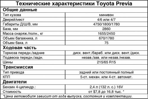 Previa - экстраординарный автомобиль. Чего стоит только и по сей день кажущийся необычным дизайн экстерьера и интерьера! В отличие от остальных участников обзора, кузов этого «японца» не несущий - он установлен на раме, что в целом повысило жесткость конструкции. Previa - 4-дверный минивэн, у которого с правой стороны всего одна боковая дверь сдвижного типа. Со временем ржавеет крепежный болт «запаски», подвешенной снаружи под полом багажника, поэтому снять ее бывает невозможно. Большая площадь остекления обеспечивает отличный обзор, но при сильных осадках «дворники» не всегда справляются с очисткой большого лобового стекла. Наиболее «нафаршированные» версии оснащены дополнительным кондиционером для задних пассажиров, пульт управления которым закреплен под потолком в центре салона.