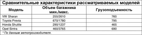 Несмотря на самый почтенный среди участников обзора возраст конструкции, хорошими качествами наделена и Previa. Она имеет наибольшую колесную базу (2860 мм) и такую же высоту, как и Sintra, поэтому водитель и его пассажиры также не будут огорчены отсутствием свободного места. Немаловажным фактором для дальних путешествий является и то, что «походный» объем багажника машины - 670 л (с установленными вторым и третьим рядами сидений) - самый большой среди участников обзора. Причем Previa способна перевозить далеко не «худо-сочных» пассажиров и довольно тяжелый багаж - она отличается самой высокой грузоподъемностью - 795 кг.