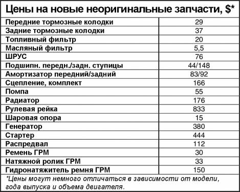 Дороже всего обходится обслуживание 6-цилиндровой версии. Даже рядовая процедура замены ремня ГРМ влетает в копеечку. Во-первых, за работу придется заплатить практически в 2 раза больше, чем на 4-цилиндровых версиях, - $ 90 (из-за плотной компоновки моторного отсека и применения сложных специнструментов). Во-вторых, в этом моторе больше сменных запчастей, и стоят они дороже. Например, в нем установлены 3 обводных ролика, а не 2, как в 4-цилиндровом двигателе (общая их стоимость $ 150 против $ 80 соответственно). Только в 2-литровом применяется гидронатяжитель ремня ГРМ (узел - около $ 150). Кроме того, в этом моторе используются свечи с платиновыми наконечниками электродов. Они способны выходить 60 - 100 тыс. км, но стоят дорого - около $ 27 за 1 шт.
