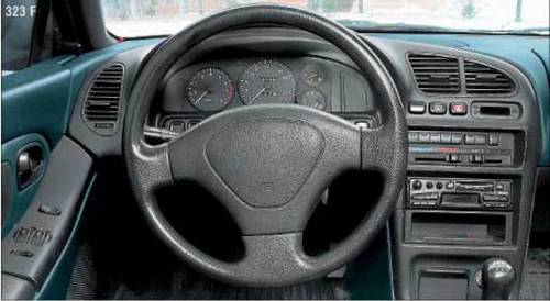 С седаном 323 S таких проблем нет. Он сориентирован на спокойных и рассудительных автолюбителей, для которых главное не эффектный внешний вид, а практичность машины. По компоновке салона и размерам багажника седан наиболее функционален. Так, несмотря на одинаковую ширину всех модификаций, троим пассажирам удобнее всего именно в седане. Колесная база хэтчбека 323 С на 100 мм короче, чем остальных, поэтому у него наименее вместительные салон и багажник. Самое большое багажное отделение у седана - его объем в «походном» состоянии - 425 л (в «трехдверке» - 300 л, в «пятидверке» - 345 л).