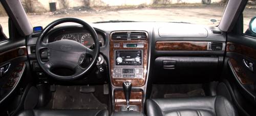 А вот с интерьером корейские дизайнеры не особо заморачивались. Внутри почти все напоминает Hyundai Sonata III: форма панели, расположение органов управления, высокая магнитола и простой блок управления климатом на пологой центральной консоли, большой четырехспицевый руль и «деревянный» пластик. Панель приборов тоже без изысков, никакого полета фантазии: два больших циферблата спидометра и тахометра, пара стандартных датчиков по бокам и светодиодный индикатор режимов АКПП, правда, с точным указанием передачи, включенной в данный момент (с первой по четвертую, даже в режиме D). Зато эта комбинация в овальном углублении передней панели отлично читается и не бликует.