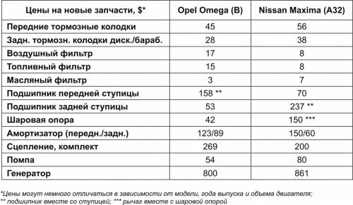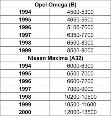 Сразу же отметим, что цена Maxima (А32) в среднем на $ 2 тыс. больше, чем Omega (B) - см. таблицу. В чем же причина? Может быть, это плата за имидж надежности японских автомобилей? А стоит ли за это переплачивать?