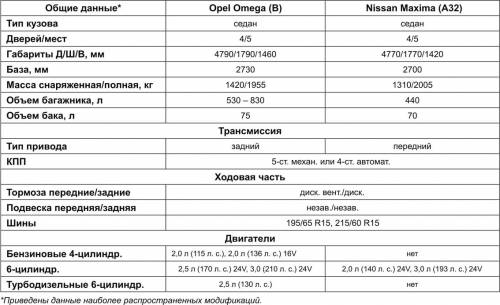 Порадует Omega и линейкой двигателей, которая состоит из четырех 4- и 6-цилиндровых бензиновых моторов и одного 4-цилиндрового турбодизеля. А вот японцы решили ограничить выбор силовых агрегатов Maxima всего двумя 6-цилиндровыми бензиновыми двигателями (см. табл.).