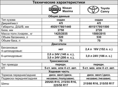 Оба автомобиля оснащались бензиновыми агрегатами. Моторы Nis-san отличаются более высокой литровой мощностью. Однако в динамике он проигрывает конкуренту. Основная причина – коробки передач Maxima отличаются более «спокойными» настройками, в то время как у КП Camry более «короткие» главные пары, что и обеспечивает этой машине лучшие спринтерские качества. Кроме того, «лишние» 400 «кубиков» в 2,4-литровом моторе Toyota дают ей запас в 12 л.с. по сравнению с 2,0-литровым двигателем Nissan. К тому же агрегат 2,4 л благодаря применению фирменной системы изменения фаз газораспределения VVT-i более эластичен. Впрочем, не стоит думать, что Camry больше подходит для активной езды… Однако для подержанных автомобилей куда важнее надежность агрегатов. По опыту эксплуатации, в этом лидирует Camry. Характерные неисправности в ее двигателях не выявлены. Разве только из-за применения некачественного топлива выходят из строя лямбда-зонды. У агрегатов Maxima проблем больше. На старых машинах отмечена неисправность расходомера воздуха. Иногда из-за поломки регулятора холостого хода сгорал блок управления двигателем. Со временем приходят в негодность дорогостоящие гидро-опоры двигателя с электронным клапаном изменения жесткости.