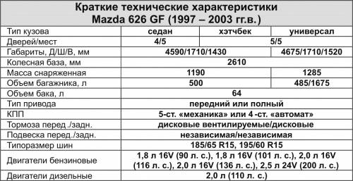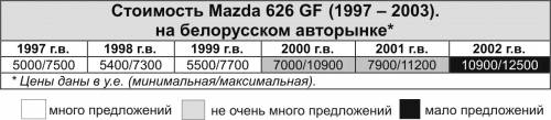 Mazda 626 GF лучше большинства своих конкурентов. Она достойно выдерживает суровое испытание нашими дорогами и зарекомендовала себя как надежный и беспроблемный автомобиль. Приобретение последнего представителя славной плеяды «шестьсот двадцать шестых» можно порекомендовать тем покупателям, для которых соотношение качество/цена являются приоритетным. Прекрасное качество сборки, доступная стоимость как самого автомобиля, так и его обслуживания и з/ч, а также истинно японская надежность проложили путь к сердцам и кошелькам наших соотечественников.