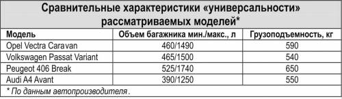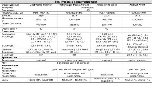 Если подходить к оценке автомобилей с практической точки зрения (а она основополагающая при покупке автомобилей с кузовом «универсал»), то пальму первенства следует отдать Peugeot 406 Break с его самыми большими багажником, грузоподъемностью и достаточно вместительным салоном. На втором месте Passat Variant. Он вполне удобный, по размеру багажного отделения занимает второе место (объем 465/1500 л), благодаря простой конструкции его подвеска служит долго, да и ее обслуживание обходится дешевле, чем у остальных сегодняшних конкурентов – Opel Vectra Caravan и Audi A4 Avant.