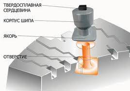 На шип действует как вдавливающая нагрузка, так и касательная. При “раскачке” шипа в его посадочное гнездо попадает влага. Соответственно, коррозия съедает фланец, удерживающий шип в покрышке, и он вываливается. Чтобы с этим бороться, были придуманы двух- и трехфланцевые шипы. Посадочное гнездо не всегда может повторить сложную форму шипа, остаются пустоты, и влага туда все равно засасывается. Но все-таки многофланцевые шипы держатся в резине крепче. Во избежание увеличения веса корпус таких шипов делают из высокопрочных легких сплавов, что несколько повышает конечную цену покрышки. На сегодняшний день многие шины имеют именно многофланцевые шипы.