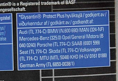 В списке признанных международных стандартов разных стран такие: США – ASTM D 3306, ASTM D 4340, ASTM D 4985, SAE J1034; Великобритания – ВS 6580, В5 5117; Япония – JIS K 2234; Франция – AFNOR NF R 15-601; Германия – FVV HEFT R 443. Как и в случае с маслами, многие производители автомобилей в инструкции по эксплуатации указывают допуски: например, для Audi, Seat, Skoda и VW – TL 774D (G12), F (G12+), для MB – 325.3; Renault и Ford требуют антифриз WSS-M97B44-D. Самые популярные классификации – ВS 6580 (British Standard) и VW: G11, G12, G12+ (Plus).