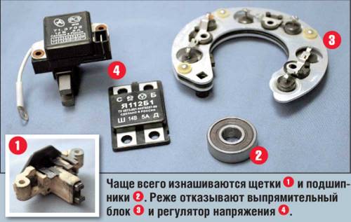 Залегают щетки коллектора. Внутрь генератора часто попадает грязь, а если на коллектор или щетки попадет капелька масла, то электрический ток будет проходить в меньшем количестве или его не будет вообще. Для устранения неполадки нужно будет вынуть щетки, помыть их в бензине, просушить, а также помыть и сам коллектор. Можно по коллектору слегка пройтись мелкозернистой наждачной бумагой. После этого все детали нужно хорошо вытереть.