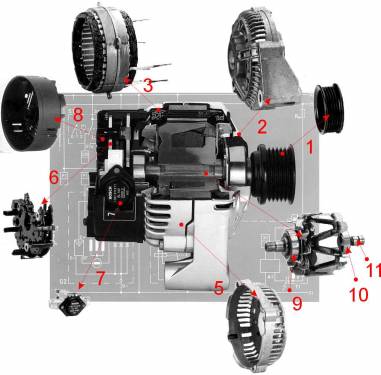 Корпус (5) и передняя крышка генератора (2) служат опорами для подшипников (9 и 10), в которых вращается якорь (4). На обмотку возбуждения якоря напряжение от аккумулятора подается через щетки (7) и контактные кольца (11). Якорь приводится в движение посредством клинового ремня через шкив (1). При запуске двигателя, как только якорь начинает вращаться, создаваемое им электромагнитное поле индуцирует переменный электрический ток в обмотке статора (3). В выпрямительном блоке (6) этот ток становится постоянным. Далее ток через совмещенный с выпрямительным блоком регулятор напряжения поступает в электросеть автомобиля для питания системы зажигания, освещения и сигнализации, контрольно-измерительных приборов и др. Аккумуляторная батарея подключится к числу этих приборов и начнет подзаряжаться чуть позднее, как только электроэнергии, вырабатываемой генераторной установкой, станет достаточно, чтобы обеспечить бесперебойное функционирование всех потребителей.