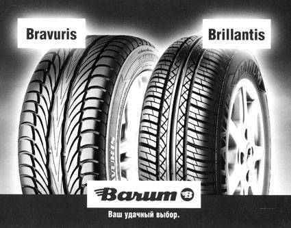 Небольшой пример. Компания Barum предлагает для летнего сезона две модели шин - Brillantis (26 типоразмеров) и Bravuris (32 типоразмера). Обе модели роднит то, что изготавливаются они в соответствии с запатентованной "Системой брекера Barum", гарантирующей низкий уровень шума при качении и повышенный срок службы. Да и резиновые смеси, используемые при производстве этих покрышек, имеют практически одинаковый состав. Однако рисунок протектора Brillantis изобилует пересекающимися поперечными прорезями, благодаря чему обеспечивается хороший разгон и эффективное торможение на мокрых покрытиях. У Bravuris с шириной профиля до 195 мм по центру протектора проходит одна широкая продольная канавка, от которой расходятся V-образные водоотводящие каналы. Более широкие шины Bravuris имеют в центре две продольные канавки. Такой направленный рисунок протектора обеспечивает моделям Bravuris повышенное сопротивление аквапланированию, способствует улучшению курсовой устойчивости и управляемости.