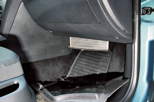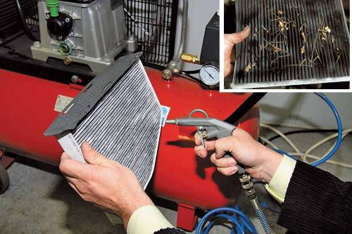 О необходимости чистки или замены фильтра свидетельствуют два фактора. Первый – сильнее запотевают стекла, второй – появляется неприятный запах после дождя, когда фильтр начинает высыхать. В процессе эксплуатации допускается продувать фильтр сжатым воздухом (под давлением 500 кПа на расстоянии 5 см от пистолета) или промывать (с моющим средством). Делать это можно несколько раз, пока после чистки будет сохраняться нормальная вентиляция, т. е. не запотевают стекла и нет неприятного запаха. В противном случае фильтр нужно менять. Обычно он работает около года (при пробеге 30–40 тыс. км в год).