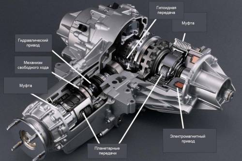 Для автомобиля Honda Legend. Устройство передачи крутящего момента соединено с легким карданным валом из композитного материала, усиленного углеродными волокнами, который передает мощность на задний узел привода. Задний узел привода аналогичен планетарному редуктору, который по сигналу электронного блока управления переключается с прямой передачи на повышающую. Узел содержит три комплекта планетарных зубчатых передач с муфтами. Крутящий момент передается через первый комплект (устройство ускорения) и затем на гипоидную зубчатую передачу, которая вращает выходной вал под углом 90° для привода задних полуосей. С каждой из сторон гипоидной передачи расположены электромагнитные муфты прямого действия. Их миссия – передавать крутящий момент на каждое заднее колесо. Работа этих муфт позволяет менять распределение крутящего момента по передней и задней осям. В зависимости от ситуации задние колеса получают от 30 до 70% общей мощности двигателя. Однако, кроме того, что эти муфты могут распределять мощность между передними и задними осями, они также умеют распределять его между задними колесами. При определенных ситуациях до 100% крутящего момента задней оси может подаваться только на одно заднее колесо |