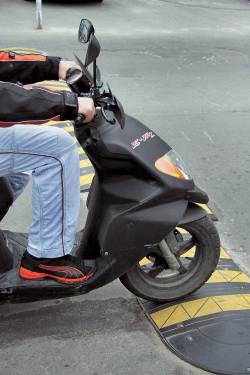 Спору нет, «лежачие полицейские» – вещь полезная и свою службу несут исправно. Вот только их размещение часто-густо не соответствует ПДД: то есть не обозначается нужными знаками. А если такие «полицейские» особенно нестандартные, лежат на скоростной прямой или в закрытом повороте, да еще в плохо освещенном месте… на приличной скорости подвеска скутера с такой гребенкой просто не справится, поэтому транспорт может отправиться в неконтролируемый полет. А падать на «полицейских» гораздо неприятнее, чем на ровный асфальт. Постарайтесь максимально вытормаживаться перед препятствием и заезжайте на него по возможности, как и в других случаях, под прямым углом.
