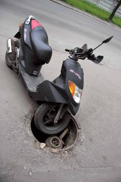 Неизменный спутник ремонтников. При срезанном асфальте башни канализационных люков возвышаются над поверхностью на 10–20 см. Это препятствие ощущает даже автомобиль, для скутериста такой удар, скорее всего, обернется полетом через руль. Если контакт неизбежен, постарайтесь максимально вытормозиться и атаковать обидчика под прямым углом, сжав руль что есть силы и сместив туловище назад. Об открытых люках и говорить нечего: если для автомобиля все заканчивается как минимум вырванной шаровой опорой, погнутым диском и порванной шиной, то для мотоцикла последствия значительно серьезнее. Но и закрытые, аккуратно заасфальтированные люки опасны – во время поворота они наверняка спровоцируют занос.