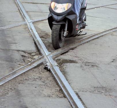 Трамвайные или железнодорожные рельсы, выступающие либо утопленные в дорожном полотне – №1 в хит-параде падений начинающего скутериста. Проезжать их, не сбрасывая скорости, можно, но только под прямым углом. Отклонение в любую сторону карается «асфальтовой» болезнью. А чтобы найти грань между моментами «упал – пронесло», просто покатайтесь в районе ближайшей рельсовой паутины не спеша, рано утром и в выходной день.