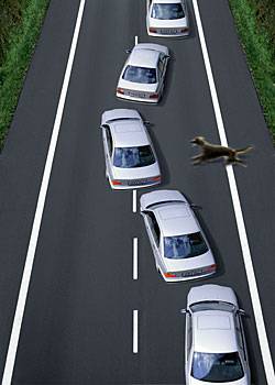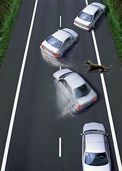 Поведение автомобиля при экстренном торможении: без ABS (слева) и с ABS (справа)